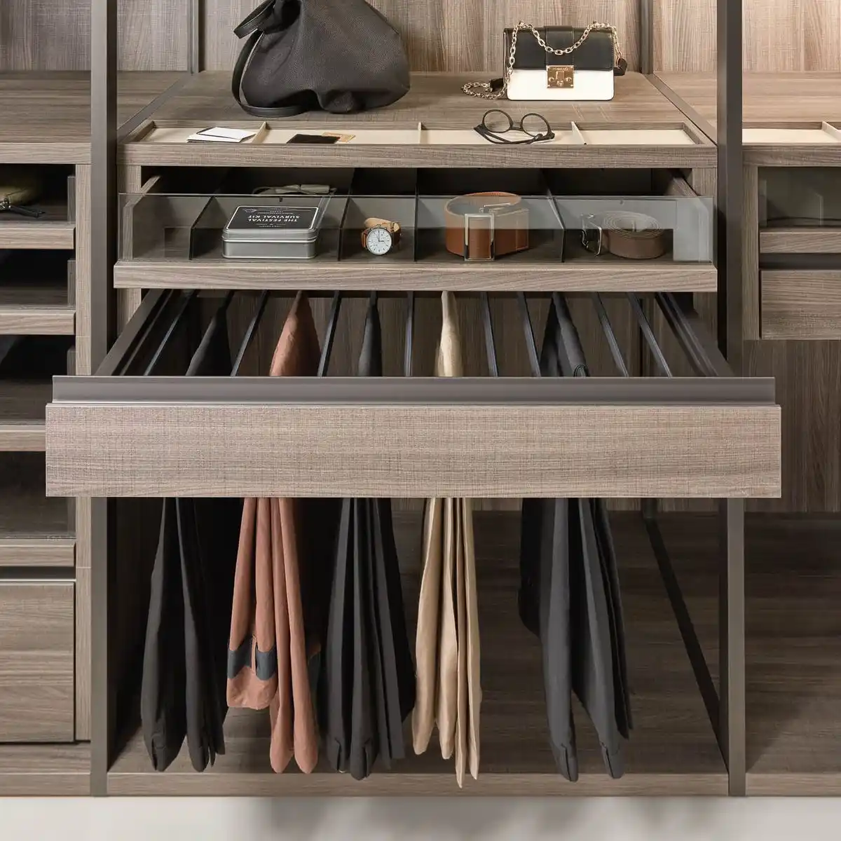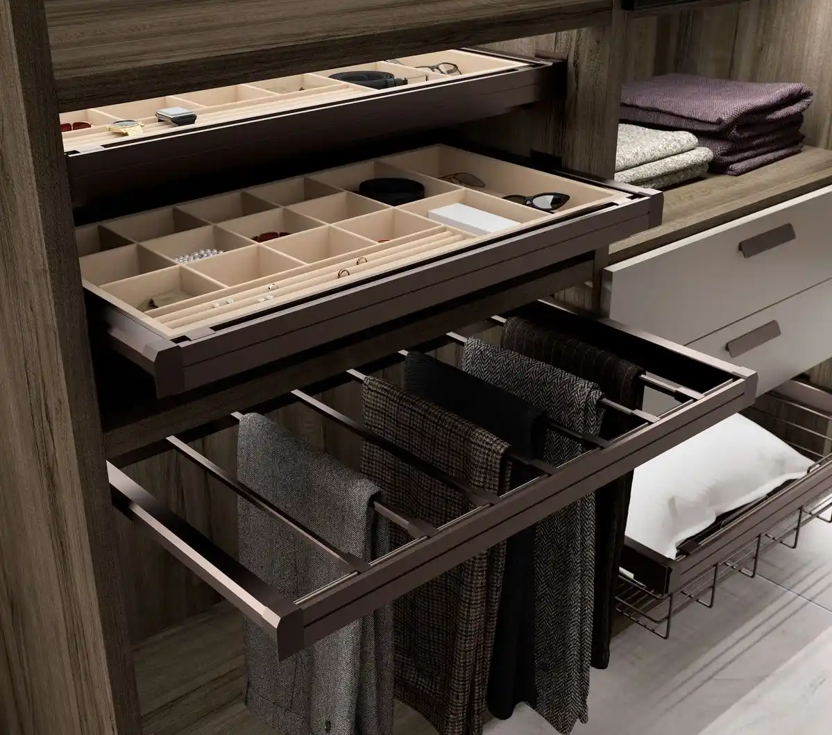Our custom closet accessories are essential for maximizing both functionality and efficiency within your closets. Designed to elevate your storage experience, these accessories not only expand your storage capacity but are also crafted from durable materials that resist rust and wear.