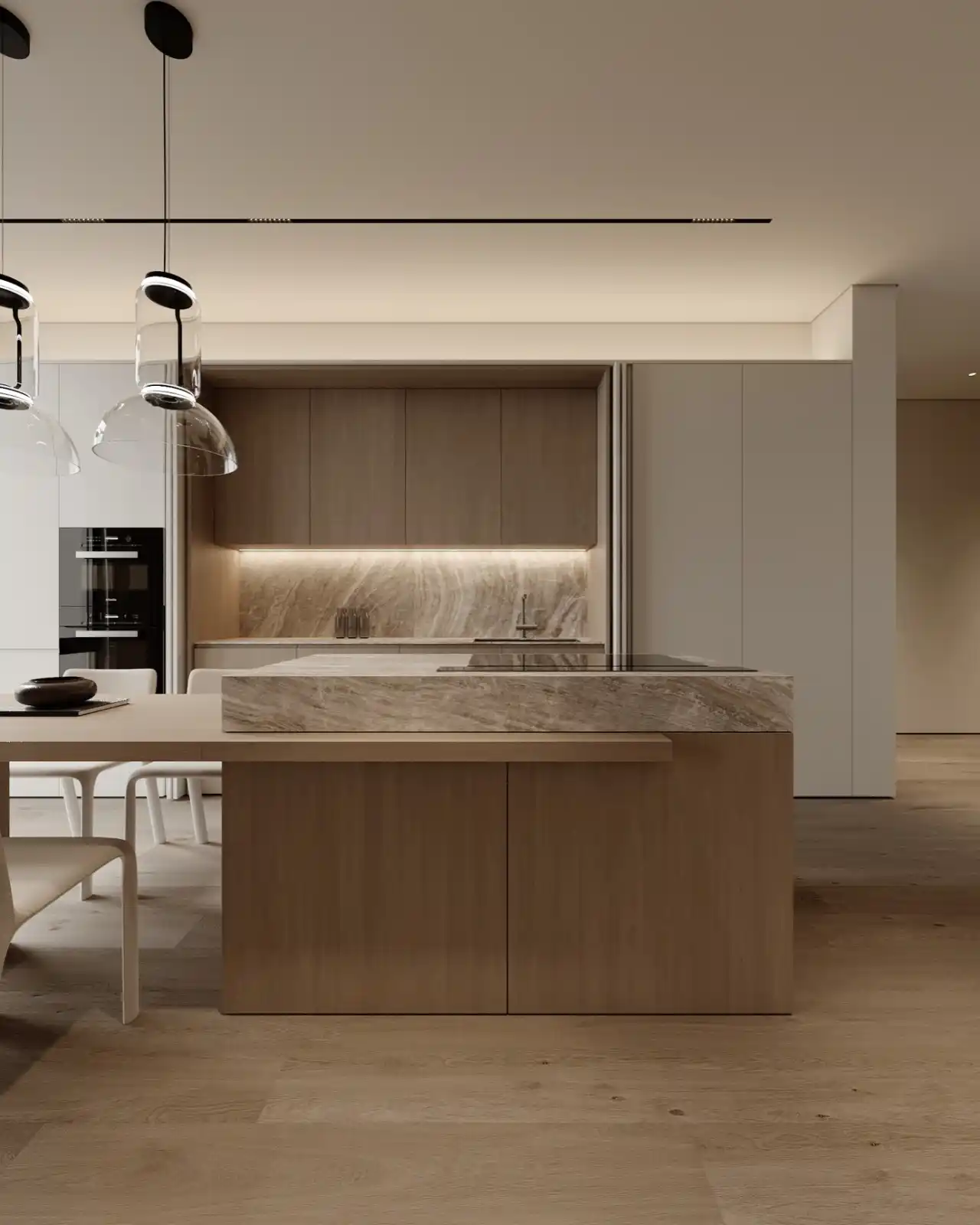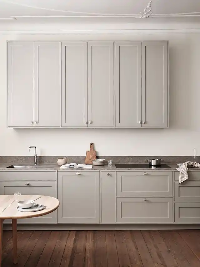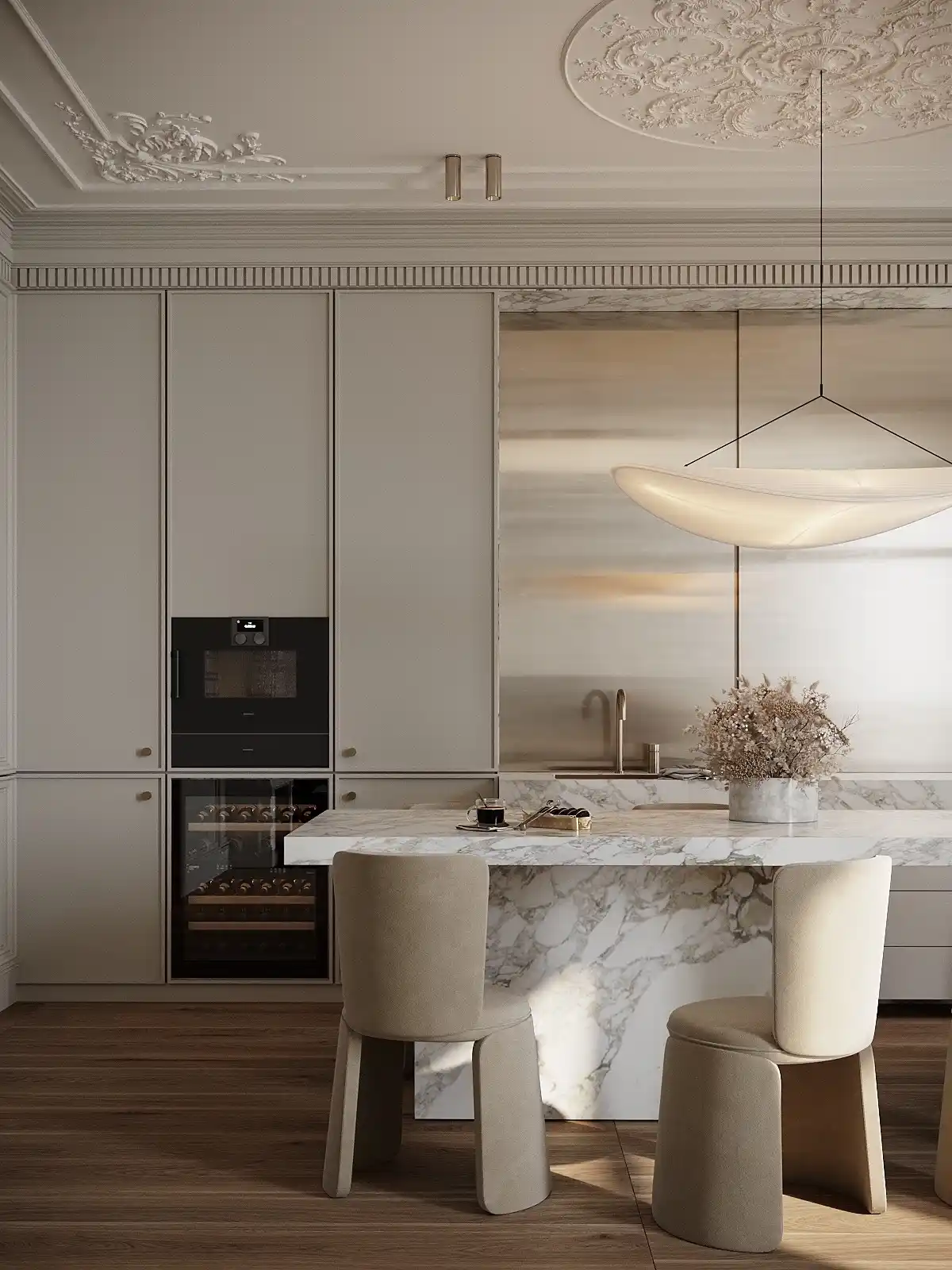Style combines neutral colors, high-quality materials, modern technologies & appliances, and minimalist design to create a chic culinary space.