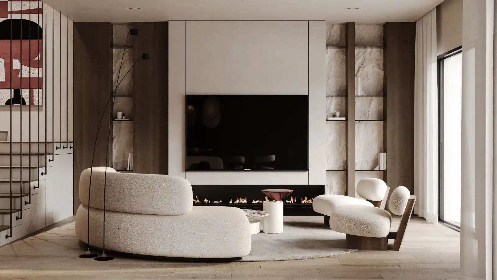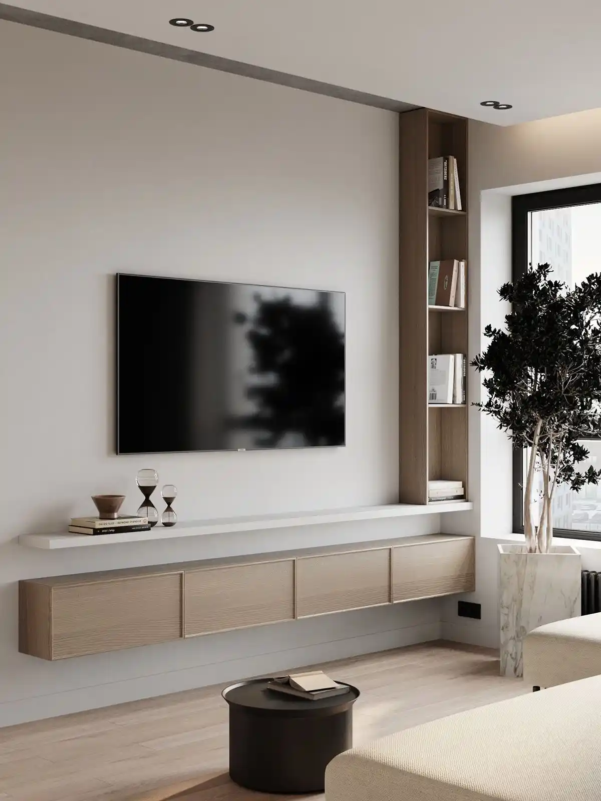 A standard modern version of TV wall organization with an optimal amount of storage space.