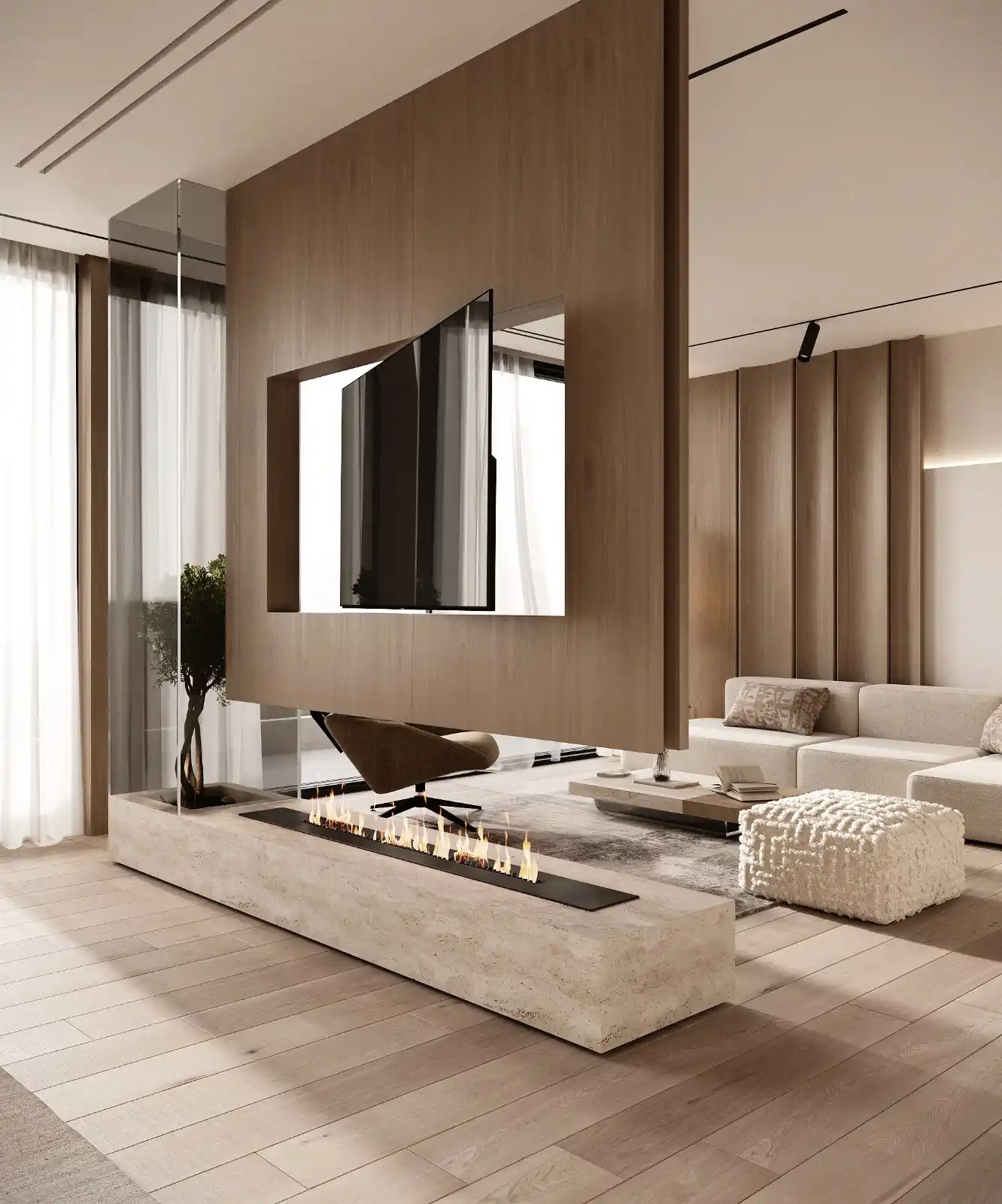 Wall panels, decorative slats, veneer, and natural stone can be used to decorate the wall.